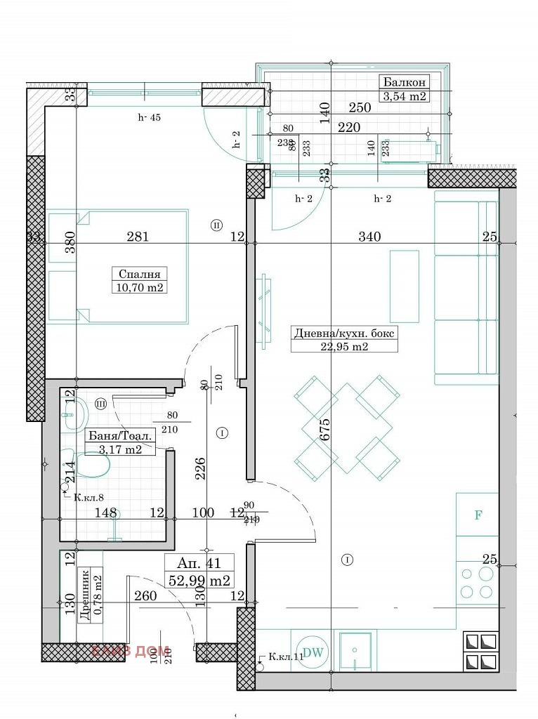 Апартаментът е на среден етаж и се състои от всекидневна с кухненски бокс, спалня, тераса към двете стаи, баня с тоалет, антре и дрешник.