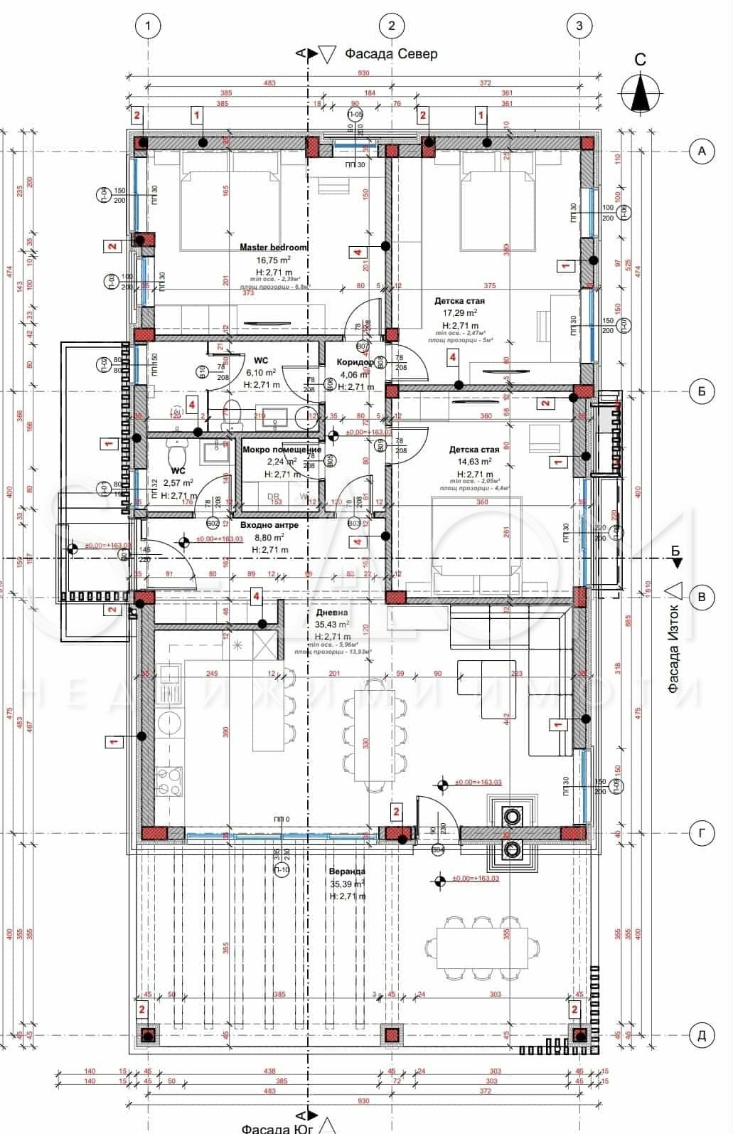 Стоманобетонна конструкция, зидария Porotherm 25 см, топлоизолация EPS 10 см..