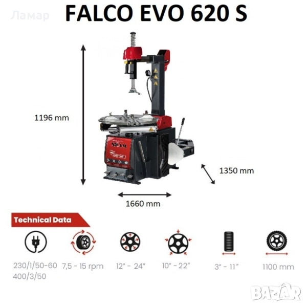 FALCO EVO 620 S са проектирани за нуждите на слабо натоварени сервизи за гуми и осигуряват максимална производителност, прецизност и комфорт на работа.