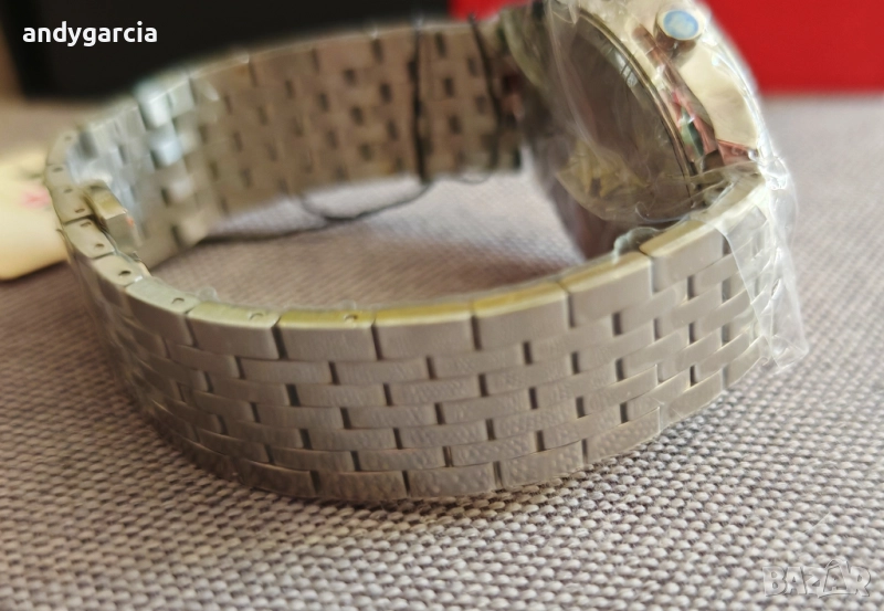Часовника е пълен комплект, чисто нов с найлонките по касата.