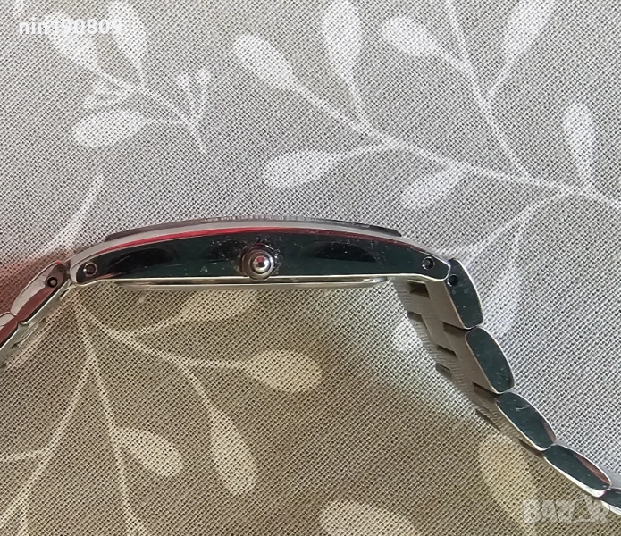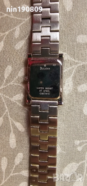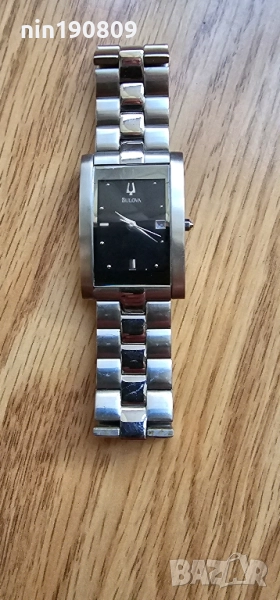 Продавам оригинален часовник Bulova със стоманена верижка и елегантен правоъгълен циферблат.