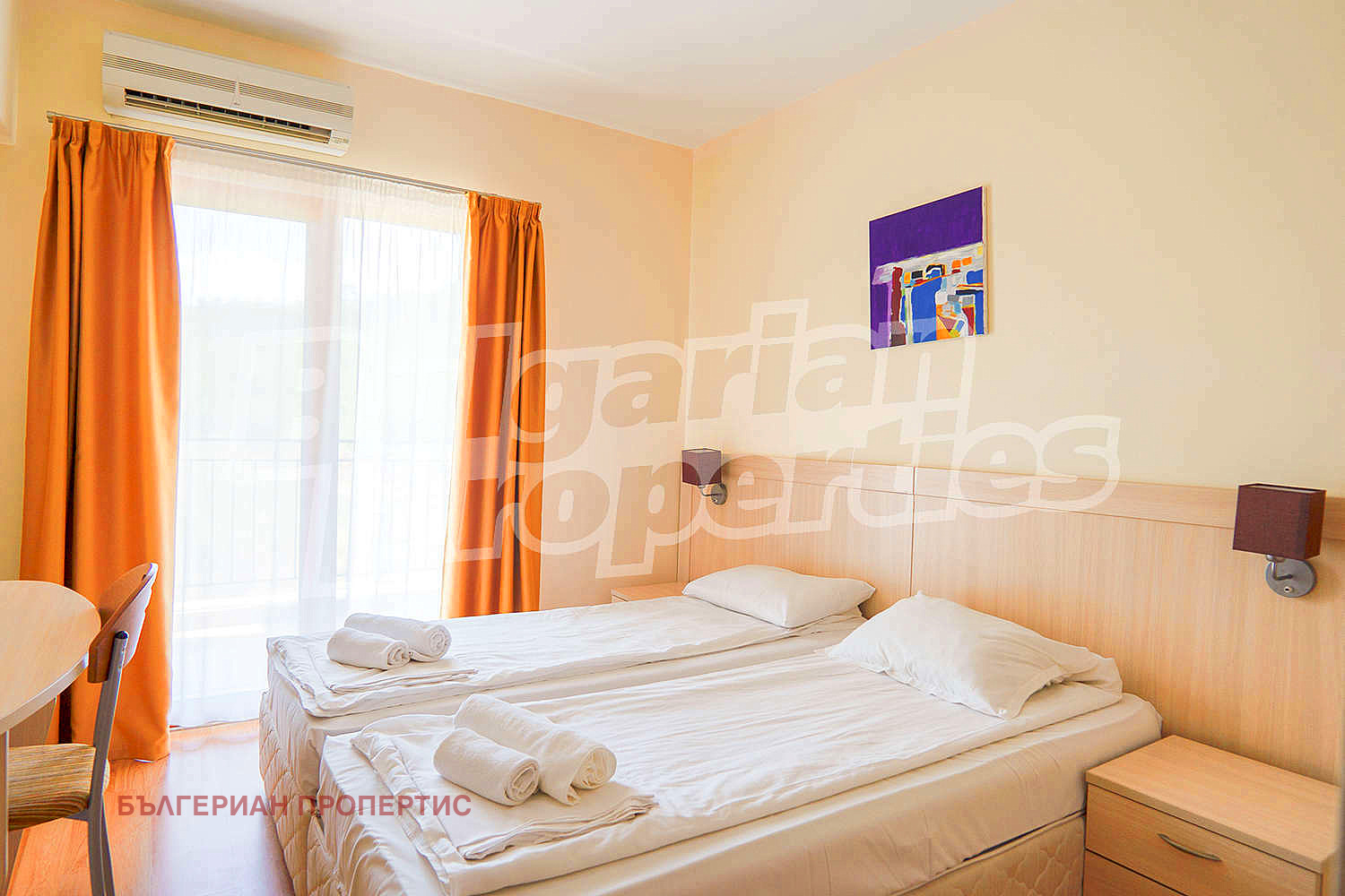 две единични легла или спалня, двукрилен гардероб, нощни шкафчета с лампи, тоалетка с огледало;
