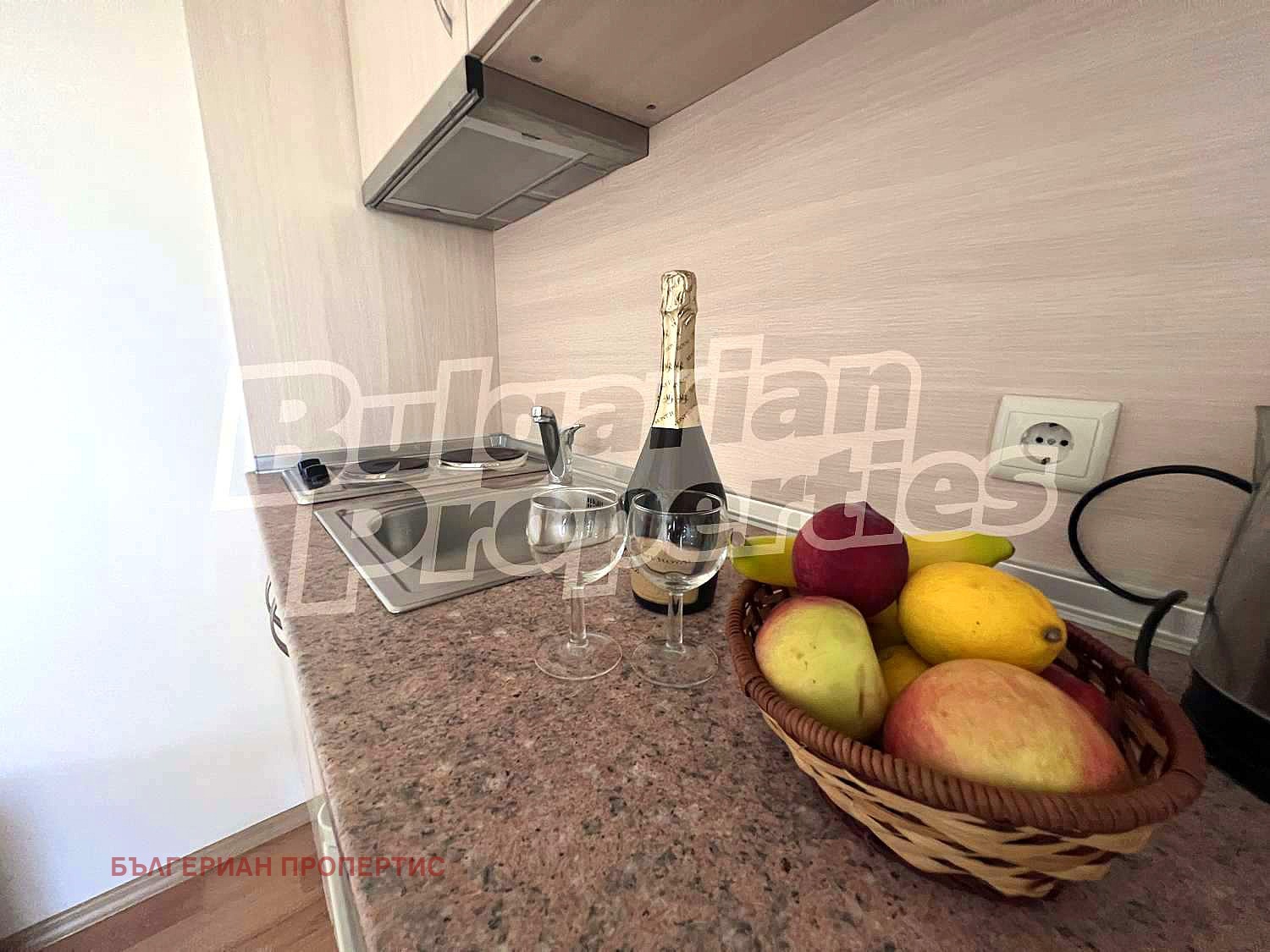 модерно обзаведен кухненски бокс с монтирани мивка, печка с два котлона и аспиратор;