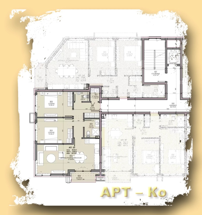 КОД 4054; Сграда, ново строителство в гр. Перник- Център. Сградата е с акт 14, което позволява още на този етап покупка с ипотечен кредит. Проектирана е като многофамилна жилищна сграда на пет етажа с магазини. Жилището е ситуирано на пети етаж, с двойна височина и изложение югоизток. Представлява двуспален апартамент с РЗП- 102,89 м2. На чиста площ от 89,08 м2 са разпределени кухня- трапезария- дневна с тераса и две самостоятелни спални, всички те ориентирани на югоизток- югозапад, както и баня със санитарен възел, сервизно помещение и входно преддверие с място за вграден гардероб. Всички дограми са 7-камерни с немски профил Rehau, троен стъклопакет, Ка + Б + 4 сезона, осигурявайки високо ниво на шумо и топлоизолация. Сградата е енергийноефективна с изградена пътна инфраструктура. Проблемите с паркирането са решени с подземни паркоместа, както и външни- открити. Осигурени са и стойки за паркинг- велосипеди. Предвидено е видеонаблюдение, контрол на достъпа и видеодомофонна система, а екстериорът ще е богато и стилно озеленен.
