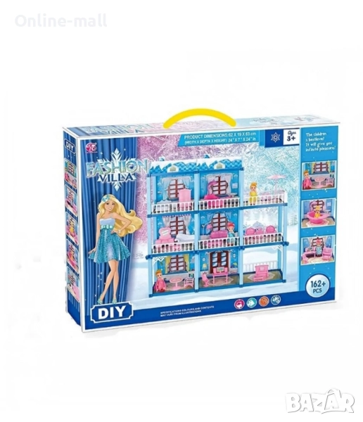 С височина 63 см, ширина 62 см и над 162 части, комплектът включва всичко необходимо за игра – мебели, аксесоари и дори кукли, готови да се нанесат в своя нов дом.