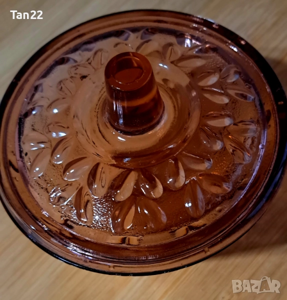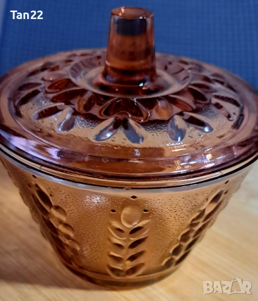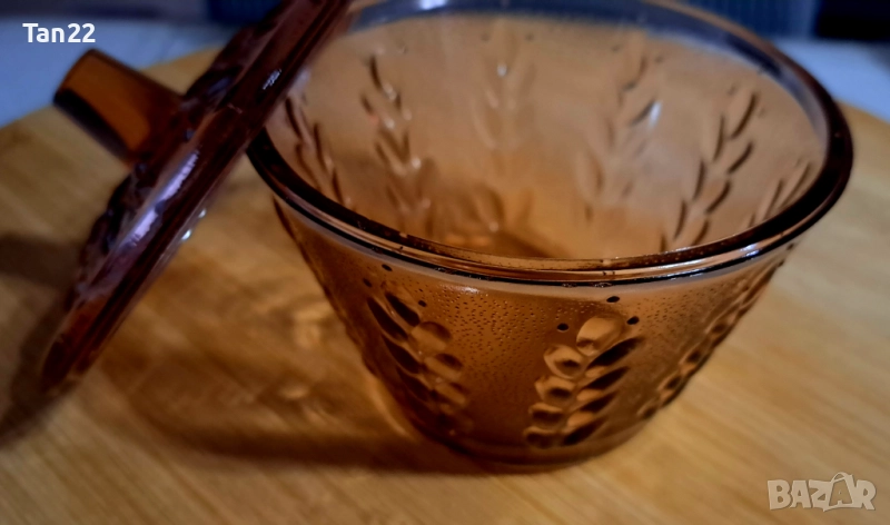 Страхотна стъклена захарница в кафяво, масивна и с капак отгоре