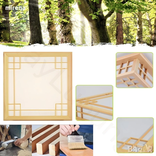 Размер и материал: Квадратната лампа в японски стил е с размери 35*35 см. Височината на осветителното тяло е 12 см. Изработена е от метал, дърво и висококачествен хартиен абажур, има добра устойчивост, антикорозионна защита и разсейване на топлината. Квадратната куха дървена рамка + LED източникът на светлина осигуряват красива светлина навсякъде.