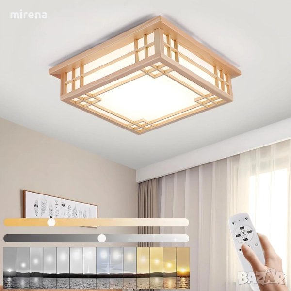 Дървена таванна лампа WayLuoung LED, дървена лампа в японски стил, квадратна 65 * 65 * 12 см, безстепенно дистанционно управление, димируема 3000K-6000K, татами лампа за спалня, хол, детска стая, офис, кабинет [енергиен клас A]