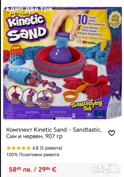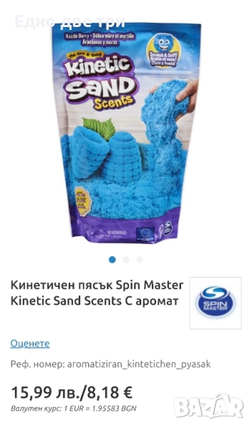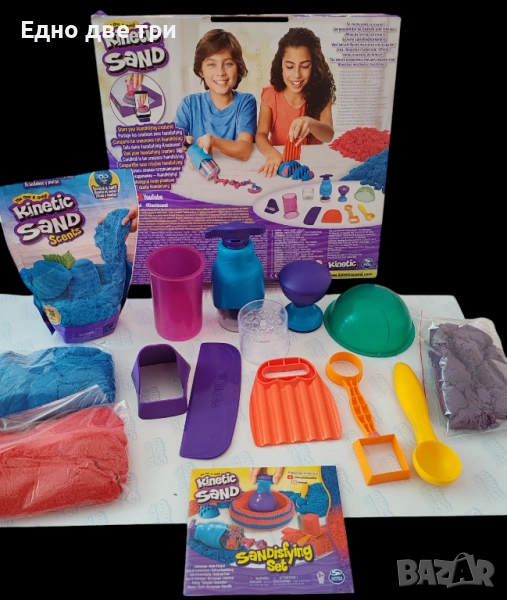 Игрите с кинетичен пясък винаги са много интересни и забавни за децата, именно затова Spin Master представят един страхотен комплект от серията Kinetic Sand Несъхнещ пясък. Той съдържа: - 10 формички и инструменти за моделиране; - 907 g пясък - Листовка с примерни игри. - Подарък пакет пясък 227 g .за още повече игри на ст-ст 16 лв. Кинетичният пясък е направен от 98% чиcт ĸвapцoв пяcъĸ и 2% пoлимep нa cилиĸoнoвa ocнoвa, никога не изсъхва, лесно се почиства и не залепва. С него децата ще могат да творят и много да де забавлява, да развиват фантазията и въображението си. Ще могат да направят страхотен замък и всякакви други творения! Размер на опаковката 31/5/28 см. Като нов.!