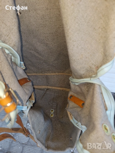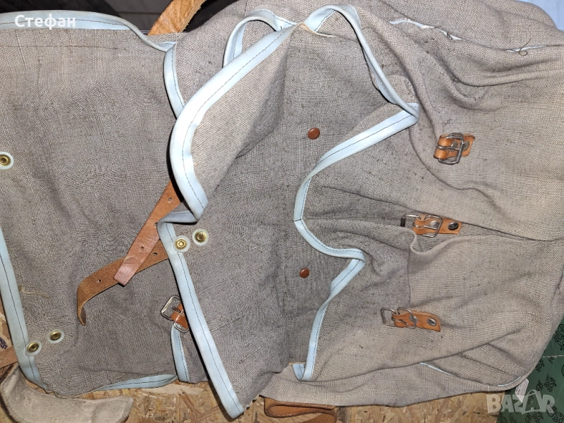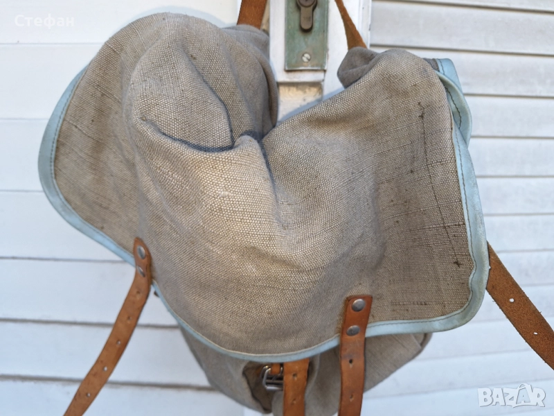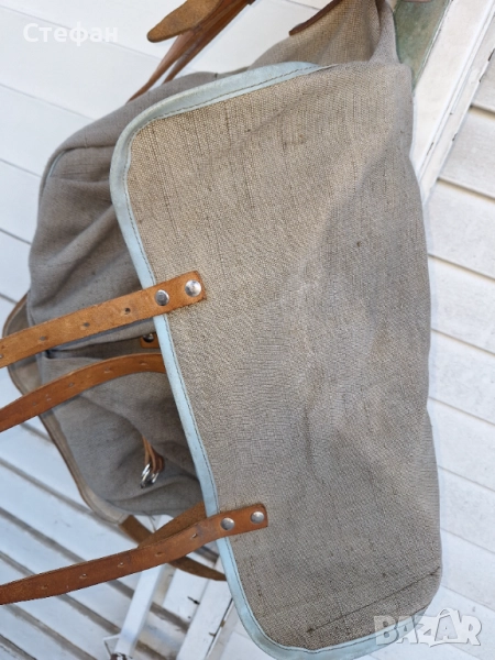 Брезентова чанта тип сухарка, от старото производство, подходяща за лов, особено за летния птичи лов, подходяща също за туризъм и риболов. Чантата е в отлично състояние, видимо и от снимките. Дължина на чантата - 37см, ширината/дебелина - 15см, височина - 30см. Има допълнителни два джоба отпред, всеки с капак, кожена презрамка за рамо.