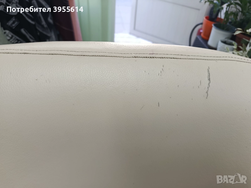 Фризьорски стол от еко кожа.С амортисьор за повдигане и сваляне на седалката.Има малка забележка по кожата на облегалката и седалката.Здрав и широк,супер стабилен стол.
