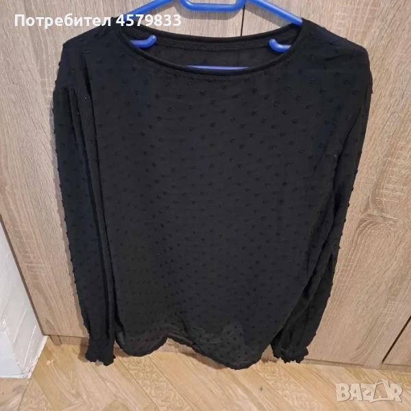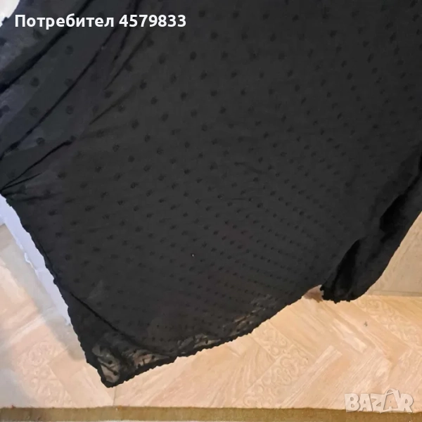 Черна дамска блуза, която прозира,цялата блуза е с точки. Едностранно гръдна обиколка-54 см, дължина -63 см. Блузата не е обличана.