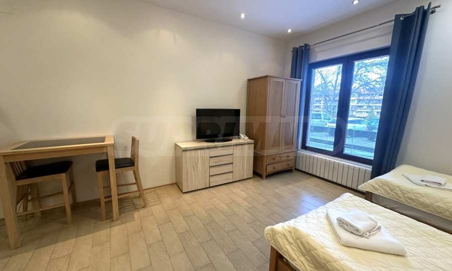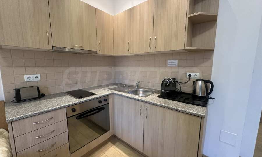 Мебели и оборудване:Коридор с портманто. Всекидневна с оборудван кухненски бокс с кухненски шкафове, вградена фурна, керамичен котлон, абсорбатор, хладилник, две легла, телевизор с шкаф за него и гардероб. Банята е с душ кабина, мивка, огледало и тоалетна.