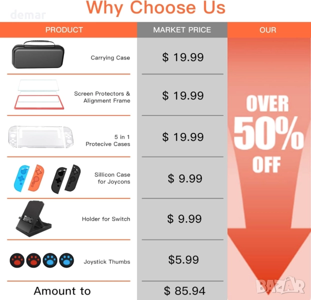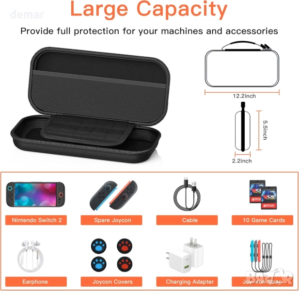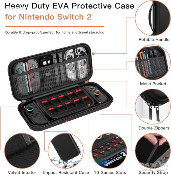 Този комплект „всичко в едно“ за Switch 2 включва защитен твърд калъф от EVA с водоустойчива външна част, кадифена вътрешна част, 10 слота за игрални карти, еластични презрамки и ергономична дръжка за пътуване, плюс прозрачен калъф за докинг станция, силиконови капаци за джойстици, дръжки за палци, протектори за екрани с инструменти, торбички за почистване и здрав държач. Калъфът осигурява устойчивост на удар, сигурно съхранение с мрежест джоб за кабели и аксесоари и двойни ципове за безопасност. Проектиран за комфорт и удобство, той предлага пълна защита, като същевременно поддържа всичко организирано, което го прави идеален за домашна употреба, пътуване или подарък за всеки повод.