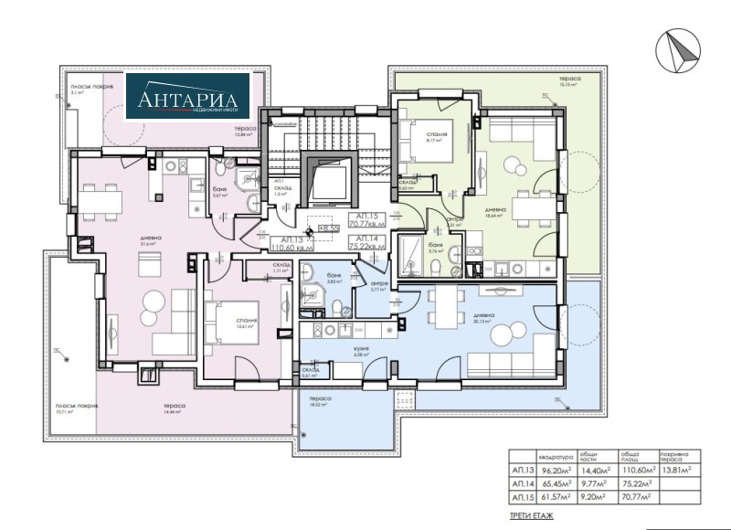 Апартаментът е на трети надпартерен етаж, състои се от дневна с кухненски бокс, баня с тоалетна и две панорамни тераси.