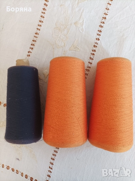 Предлагам 17 броя чилета с винено червена коприна за бродерия от старото българско производство. Три огромни макари за шиене на машина,памучни конци в оранж и тъмно сиво. Цена- 1 евро брой.