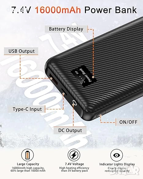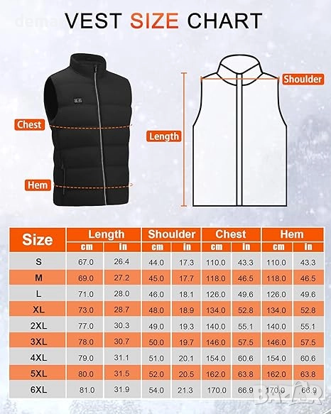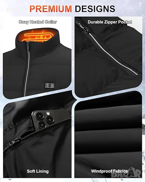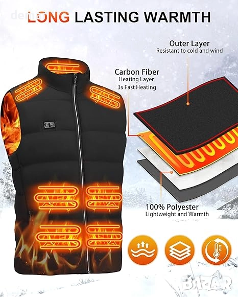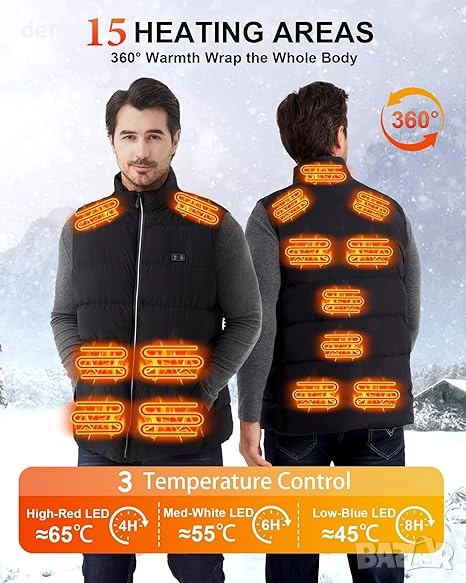 Този отопляем елек е изработен от лек, ветроустойчив и устойчив на разкъсване полиестер с мека, приятна за кожата подплата за комфорт и топлина. Разполага с 15 бързозагряващи се зони от въглеродни влакна отпред и отзад, осигуряващи равномерно затопляне на 360° само за 30 секунди с три регулируеми температурни настройки. Захранва се от батерия с капацитет 16000 mAh, която осигурява до 10 часа употреба и служи и като преносима батерия (power bank), като включва USB и DC портове за гъвкаво зареждане. Може да се пере в пералня с извадена батерия, идеален е за дейности на открито като туризъм, ски, риболов или мотоциклетизъм, а също така е практичен и грижовен зимен подарък.