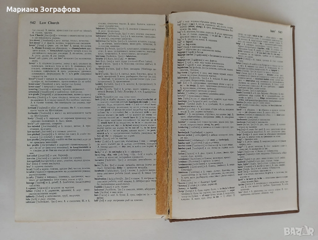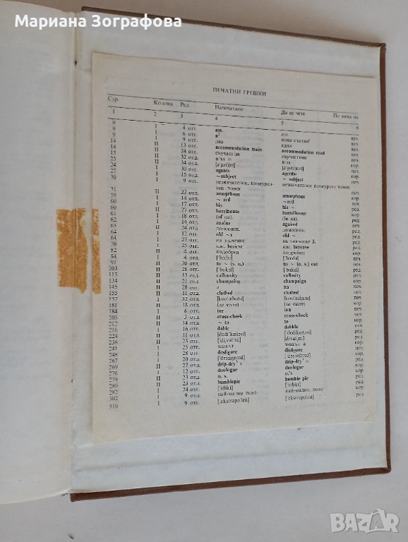 В края на речника има прикрепване на страници 542-543 със тиксо, както и листа с печатни грешки (сн.6,7).