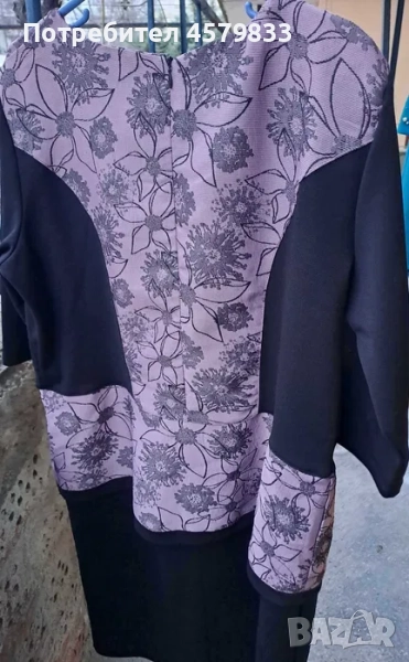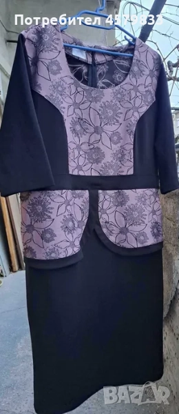 Роклята е обличана веднъж за повод, но не е моят модел. Горната ѝ част е светло лилава. Ръкавите ѝ са три-четвърти. Размер 4 пъти XL. Обиколка подмишници-100 см. Обиколка на ханша-97 см. Аз съм 1,57 см, роклята ми като дължина ми стигаше под коленете.