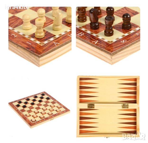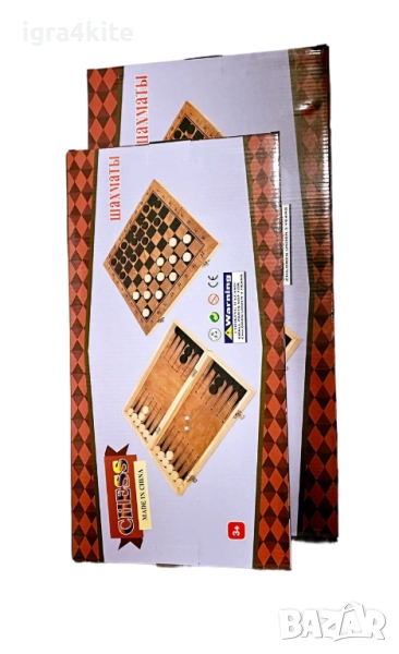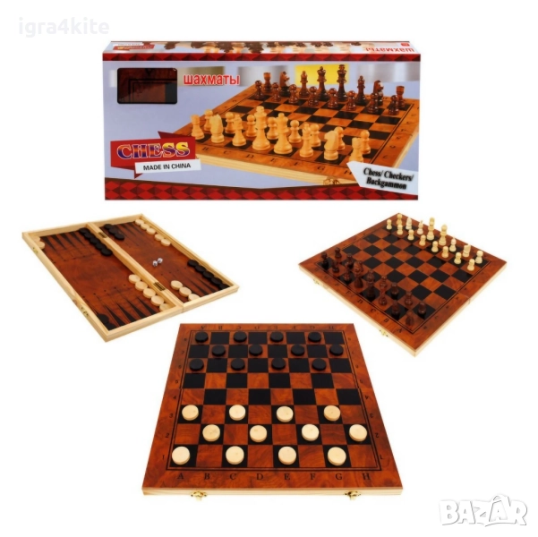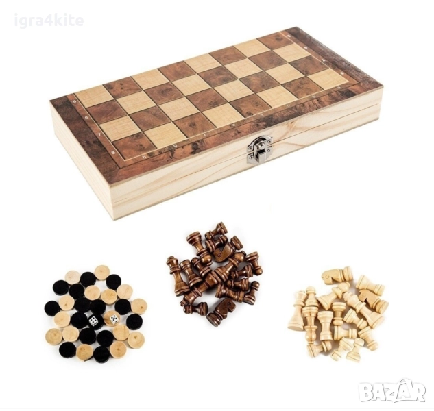 Дървен шах 3-в-1 с три класически игри: Шах Табла и Дама в 2 размера