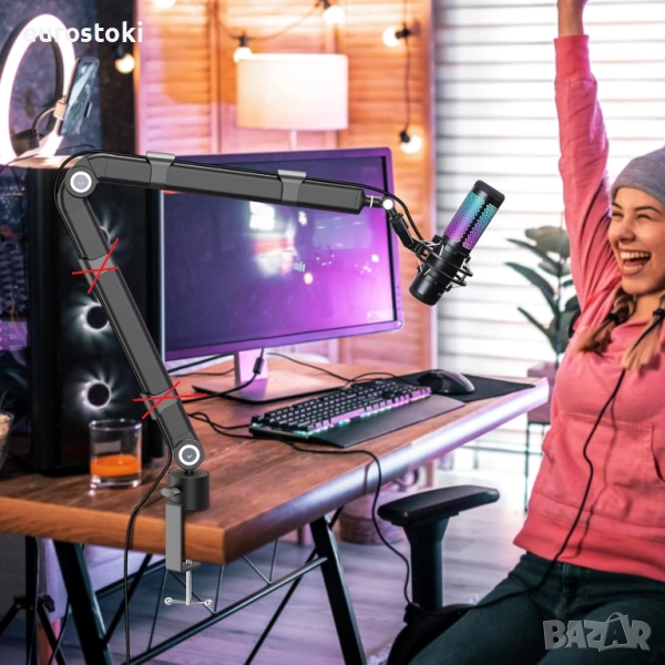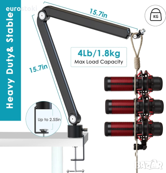 Претегленото рамо за микрофон осигурява стандартно натоварване до 1,8 кг, а вашият USB микрофон може да бъде поставен под всякакъв ъгъл. Без провисване, просто стабилна като скала.