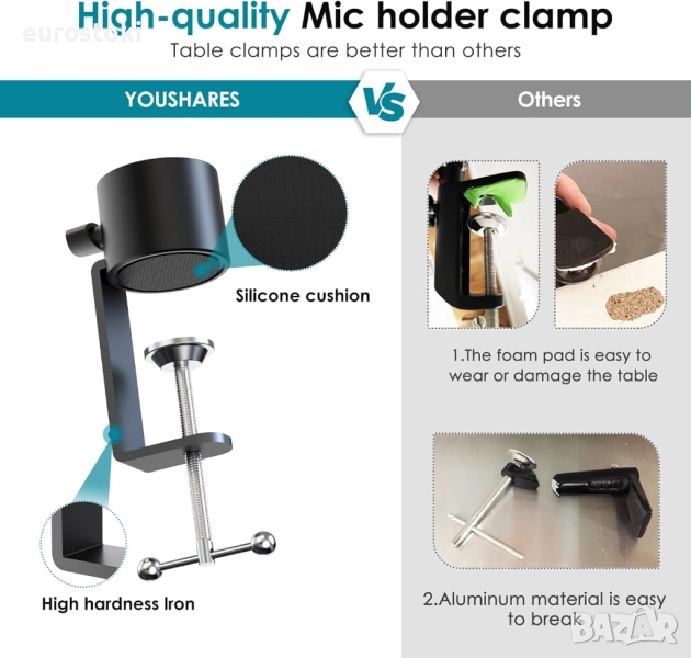 Комплектът включва: 1 x рамо за микрофон, 1 x скоба за бюро, 1 x адаптер с винт, 2 x скоби за кабели