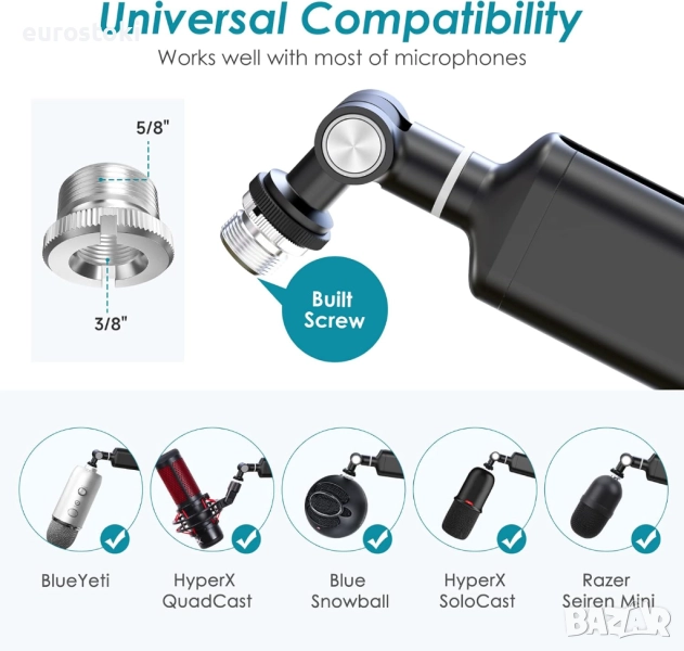 Метална стойка за микрофон с адаптер от 3/8" до 5/8", съвместима с повечето тежки или леки микрофони и множество модели амортисьори за микрофони, като например: Hyperx QuadCast, Blue Yeti, Nano, Shure SM7B, Shure MV7, RODE, Blue Snowball, Razer Seiren Mini и други геймърски микрофони. Чудесна за запис, пеене, видео разговори, Zoom срещи, видео продукция за обучения, онлайн обучение, подкастинг, игри и стрийминг на живо.