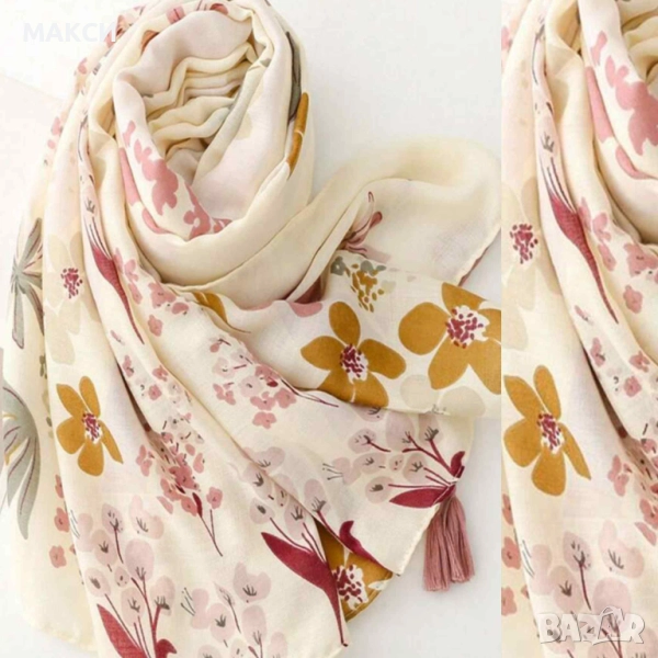 Модерен многофункционален слънцезащитен шал с мини пискюлчета Бохо стил с красиви цветя в две разцве → Обява 51547092
