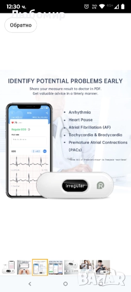 ♥ЕКГ с AI анализ: Идентифициране на сърдечни проблеми чрез AI анализ, като сърдечна аритмия, сърдечен арест, предсърдно мъждене (ПМ), тахикардия и брадикардия и преждевременни предсърдни контракции (ПК).