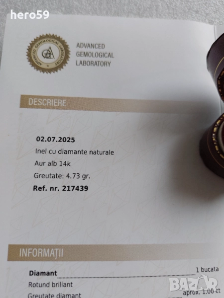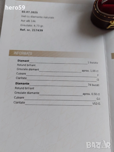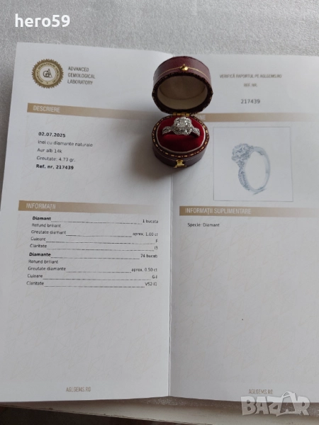 Предлагам за продажба дамски златен 14к пръстен с централен брилян един карат, плюс 74 малки брилянти с общо тегло от 0.5 карата,или тотал 1.5 карата,придружени от сертификат в който всичко е описано подробно.Камъните са с много добри параметри като чистота и флорисценция.УВАЖАЕМИ ГОСПОЖИЦИ,ГОСПОЖИ,И ГОСПОДА,ПОРАДИ НОВАТА ПОЛИТИКА НА САЙТА СЕ НАЛОЖИ ДА ПРЕМАХНА НЯКОЛКО СТОТИН ОБЯВИ,А И МНОГО, САМИЯТ САЙТ МИ ИЗТРИ,ПОРАДИ ТАЗИ ПРИЧИНА СЕ НАЛАГА ДА ПРАВЯ ЛОТОВЕ НА ДАДЕН ВИД АРТИКУЛИ ИЛИ ДА ГИ ПРЕМЕСТВАМ В ДРУГИ МОИ ПРОФИЛИ В БАЗАР.НА ВСИЧКИ МОИ ПРОФИЛИ СТОИ ЕДНА И СЪЩА СНИМКА НА КУЧЕТО МИ.