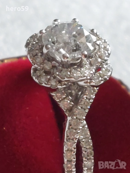 Прекрасен дамски златен пръстен с 1 карат брилянт плюс 74 брилянта тегло 0.5 карата,сертификат → Обява 51550355