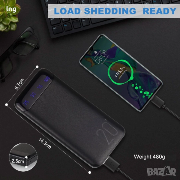 Голям капацитет (20000mAh):Достатъчен, за да заредите напълно повечето смартфони няколко пъти.