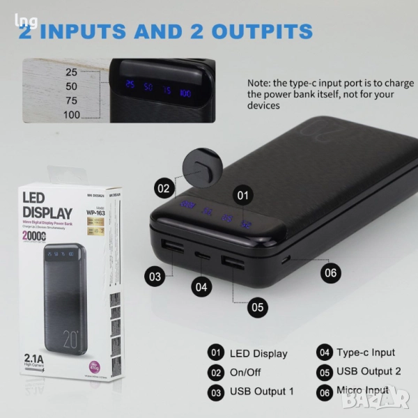 Два входа за зареждане: Зарежда се удобно чрез Micro USB или Type-C порт. (Забележка: Type-C портът е само за зареждане на самия пауър банк).
