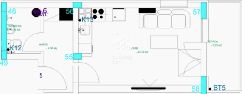- РАЗПРЕДЕЛЕНИЕ: Всекидневна с кухненски бокс с площ от 20,40 кв.м., антре, баня с тоалетна и тераса*.