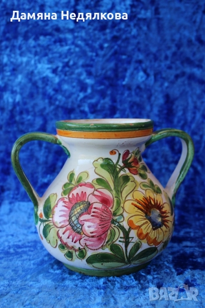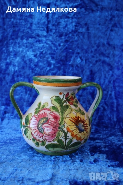 Красива стара керамична ваза с две дръжки, богато украсена с ръчно рисувани цветя в ярки и живи цветове – зелено, жълто, червено и розово. Декоративна и колоритна, тя носи типичен дух на европейска народна керамика (вероятно италианска или испанска школа).