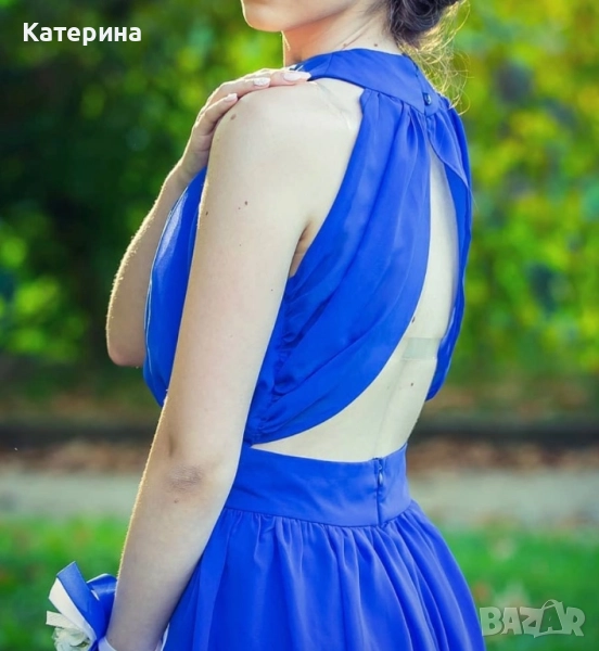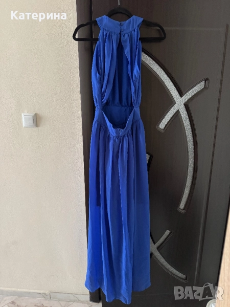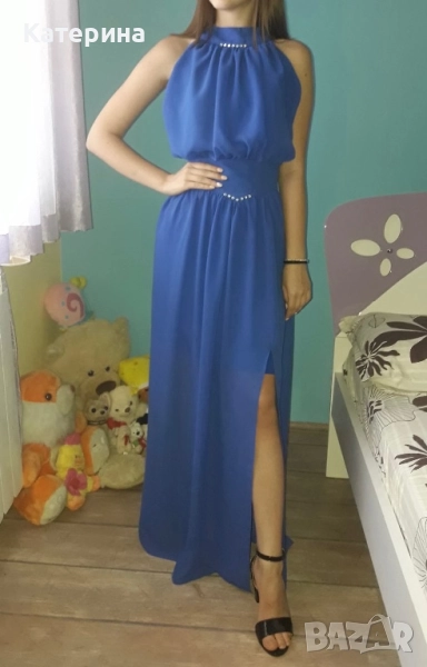 Дълга официална рокля в синьо, с цепка и гол гръб, има цип в частта на талията. Роклята е обличана само веднъж за повод. Дължина на роклята от талията е 110см. Обиколка на талията 63см.