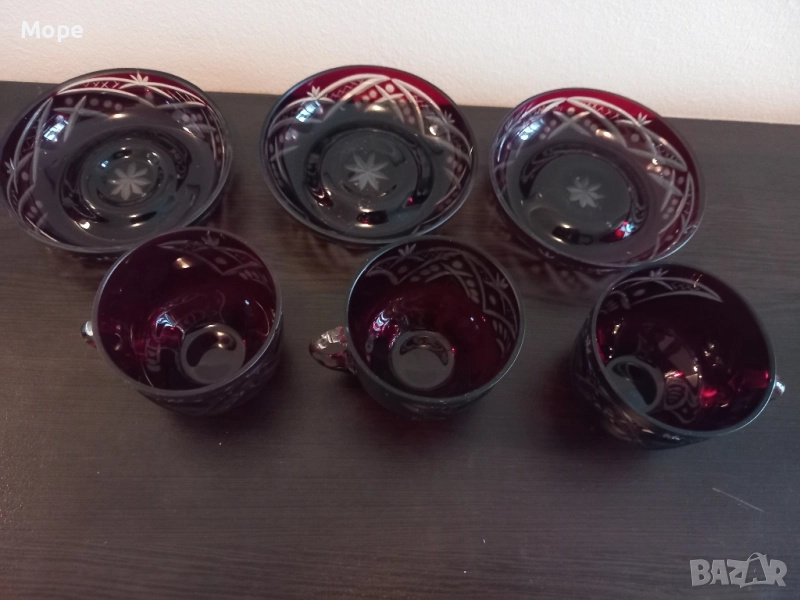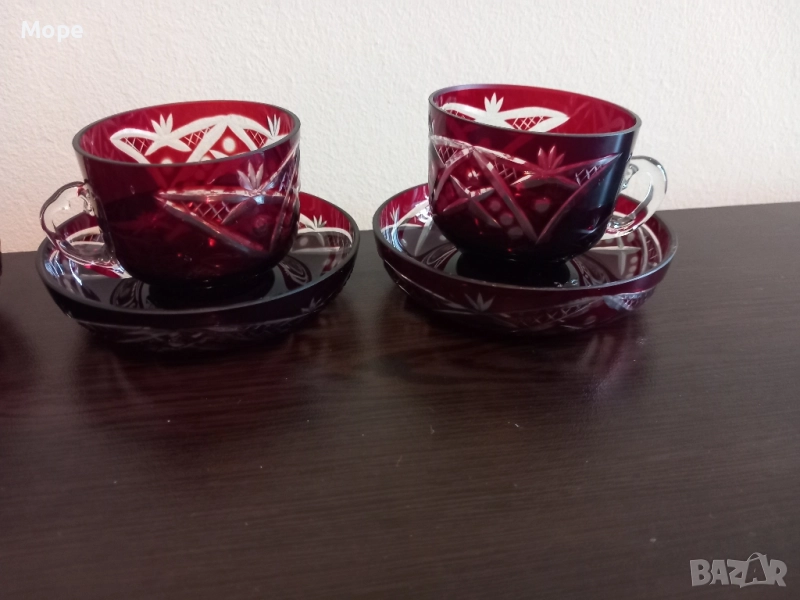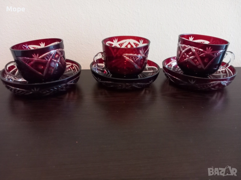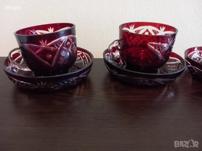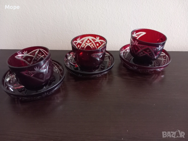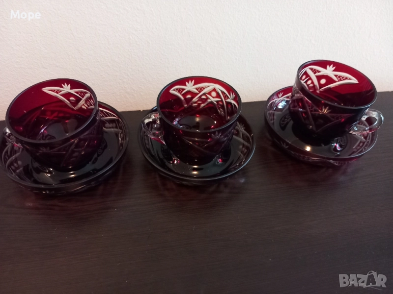 Кристални чаши за кафе три броя с чинийки, червен гравиран кристал без драскотини.