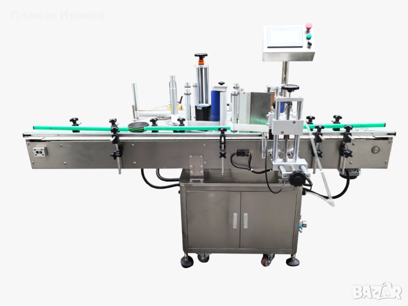Машина за поставяне на самозалепващи се етикети върху бутилки с цилиндрична форма.