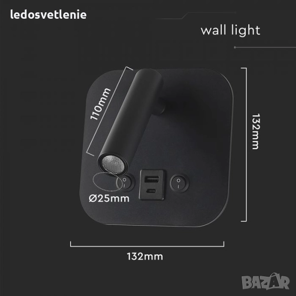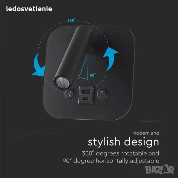 Черна или Бяла LED Хотелска Стенна Лампа с Двустранно Осветяване V-tac за над Нощен шкаф в Спалня с USB и USB C