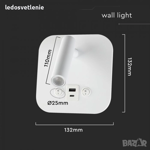 LED 8W Хотелска Стенна Лампа с Двустранно Осветяване V-tac за над Нощен шкаф в Спалня с USB и USB C