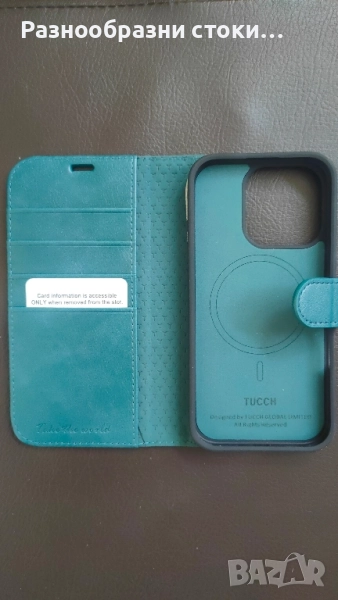 Калъф TUCCН за iPhone 16 Pro (6.3 инча) в елегантен тюркоазен цвят. Калъфът е тип портфейл, с джобове за карти и сигурно магнитно закопчаване. Предпазва телефона ви от удари и надраскване, а вградената Magsafe-съвместима подложка позволява лесно безжично зареждане.