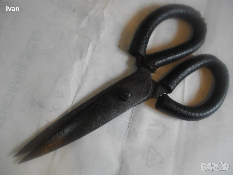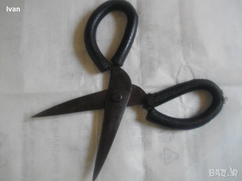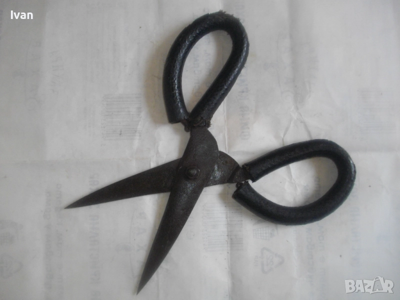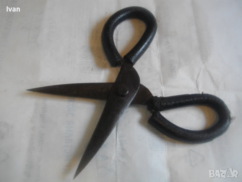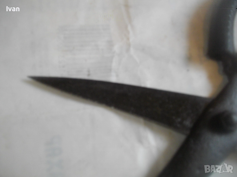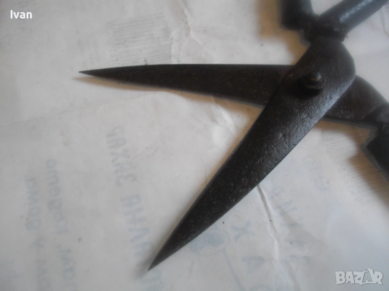 ОПИСАНИЕ на старо качество ръчна ножица. Цена 99 лв - твърда цена/без коментар. Българска, от Соц времето на НРБ. Отлично състоняие - визуално и работно. Остриета големи ,без никакви наранявания. Реже добре хартия, картон, плат и други повърхности. Остриета фабрично заточени с наклон. Дължина на инструмента - 295 мм. Големи дръжки с покритие шлауфка / маркуч. Отваряне на остриетата за рязане - до 155 мм. Техническо работно състояние на ножицата - без забележки. Ширина задна част на дръжките уши - 15 см.