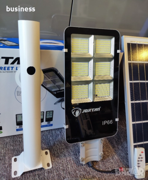 Соларна осветителна система JORTAN 400W. Състояща се от соларен панел, LED прожектор, кабели, тръба, монтажни скоби и дистанционно управление. Соларен панел 7.2V-28W. Дължина на камера от панела до прожектора 4 метра кабел, което позволя монтаж на отдалечено място спрямо прожектора. Акумулаторна батерия от 3.2V 36000mAh, захранва супер ярък бял светодиоден фенер, който осветява 6000 лумена.