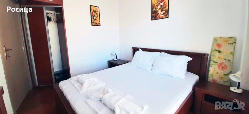 · Спалня: Двойно легло, две шкафчета с нощни лампи, гардероб със сейф, голям шкаф, огледало, ютия, дъска за гладене.