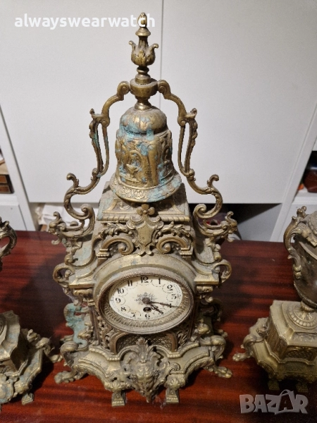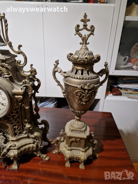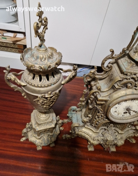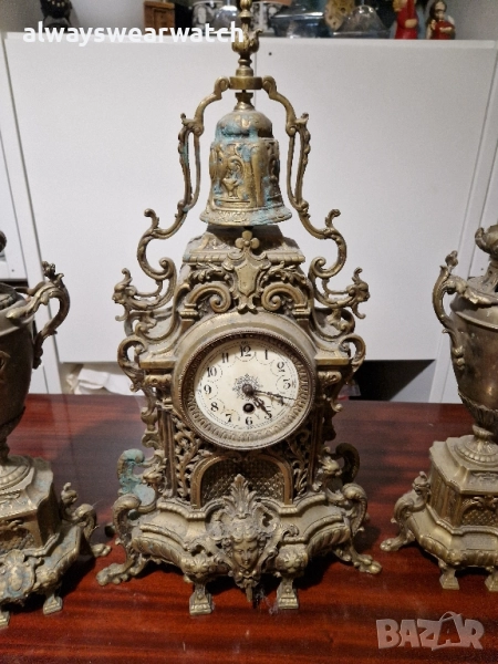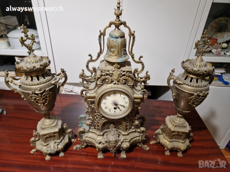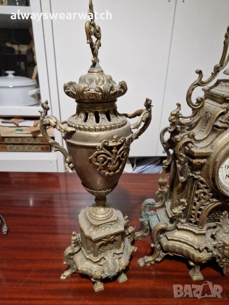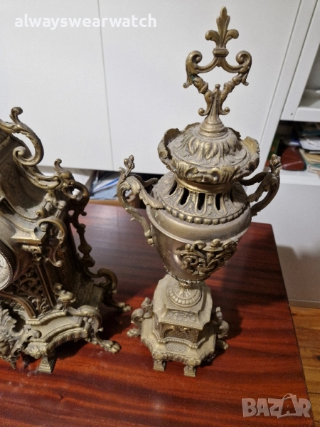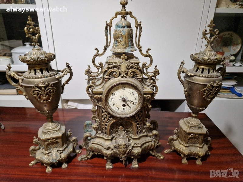 Античен бронзов каминен часовник комплект с 2 канделабри - вази.
