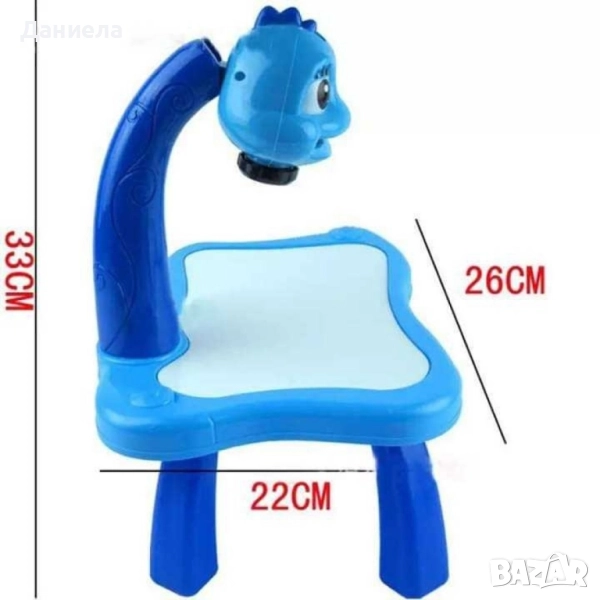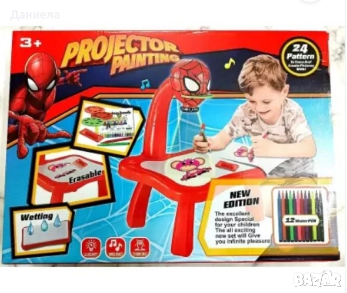Детска масичка за рисуване с вграден проектор. Размери 39х27х7 см. 24 карти за проектиране, 12 флумастера, 3 диапозитива, 1 блок за рисуване. Подходяща за деца над 3 г! Варианти - Синя - динозавър, Червена - Спайдърмен, Зелена - Хълк
