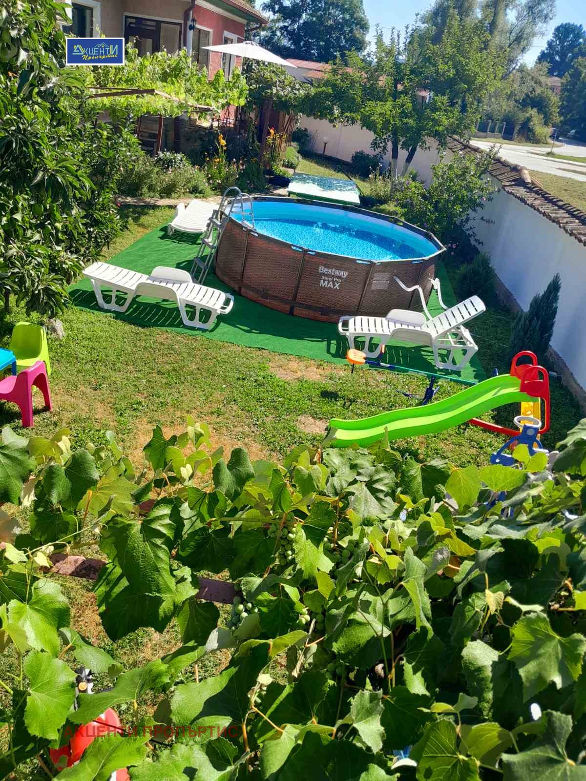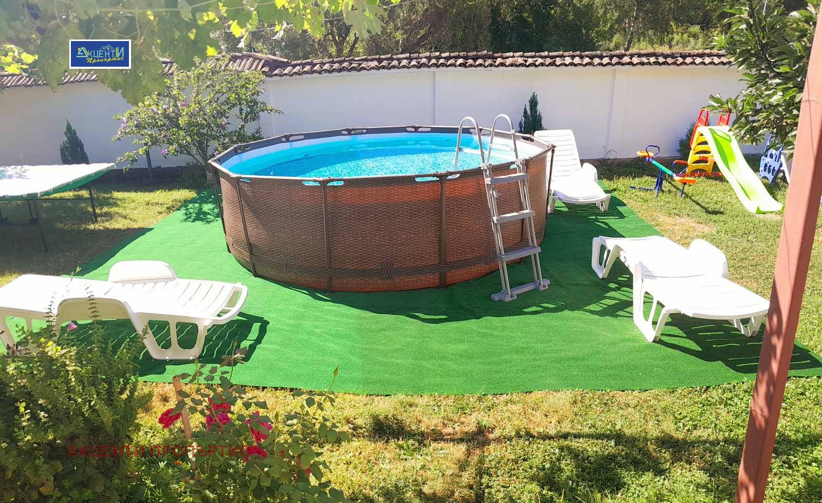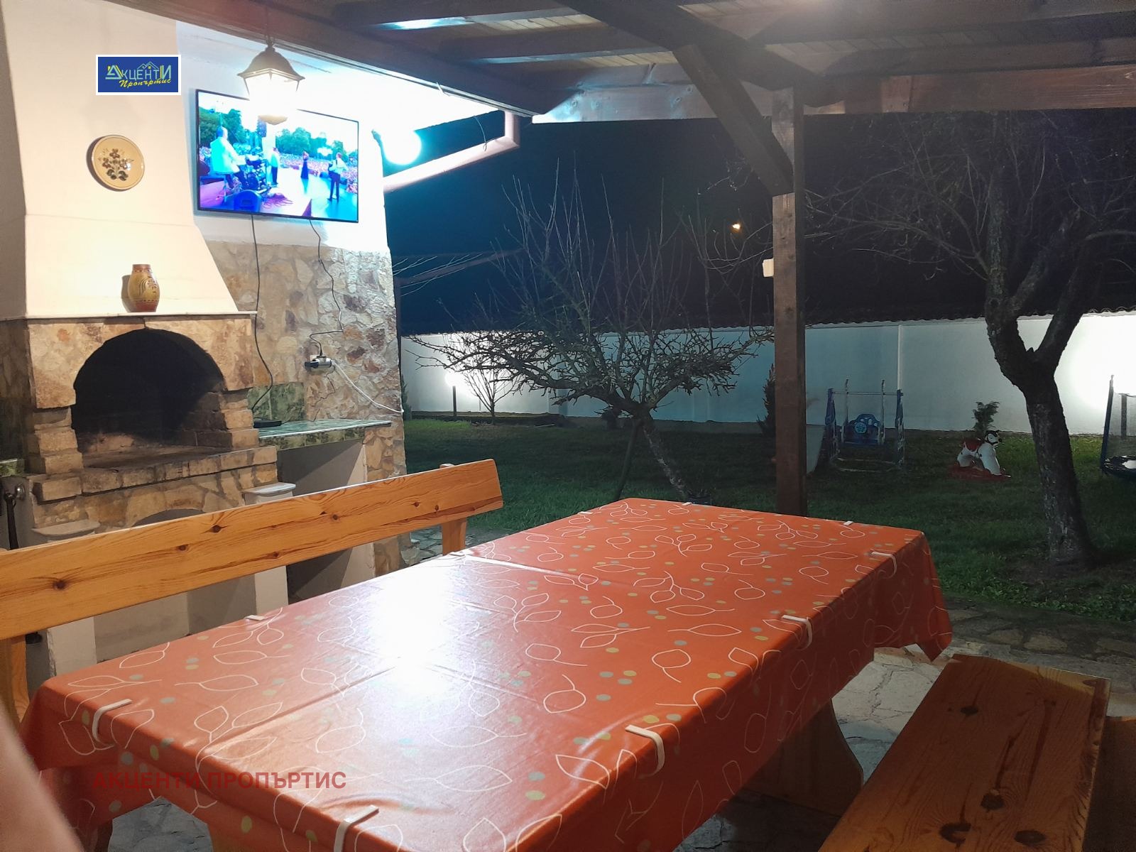 Дворното място е отлично поддържано, с обособен в него детски кът, басейн през лятото, тенис на маса, барбекю и др. удобства. В дворното място има гараж с площ от 18кв.м. и стопанска постройка от 60кв.м. Имотът е подходящ както за вашия нов дом, така и инвестиция и използвана като къща за гости.Обявената цена включва цялото налично обзавеждане. Имотът е отлично поддържан и готов за нанасяне. Номер на офертата 1110241.