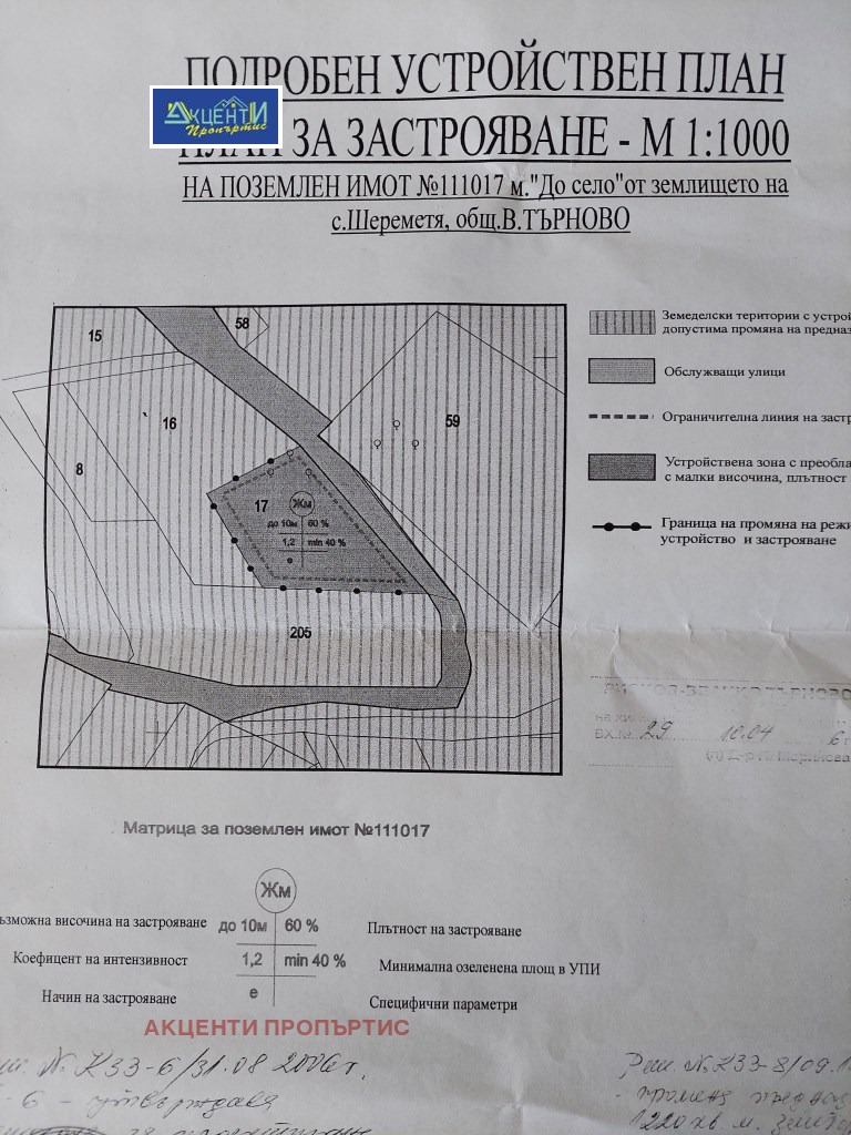 Агенция за недвижими имоти акценти Пропъртис Ви предлагаме парцел, с ПУП и План за застрояване, в с.Шереметя.Парцелът е с площ от 1220кв.м.Номер на офертата 20325.