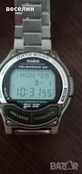 CASIO модел 1995 година, от серията Casio Data Bank с функционалност Telememo 30. Това означава, че може да се съхраняват до 30 телефонни номера в паметта на часовника. Други функции които притежава часовника са дата (ден от седмицата, месец и година), аларма, втора часова зона, таймер, хронометър и подсветка на дисплея. Състоянието му е добро за годините си. Възможен бартер за друг часовник Casio.