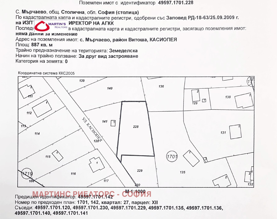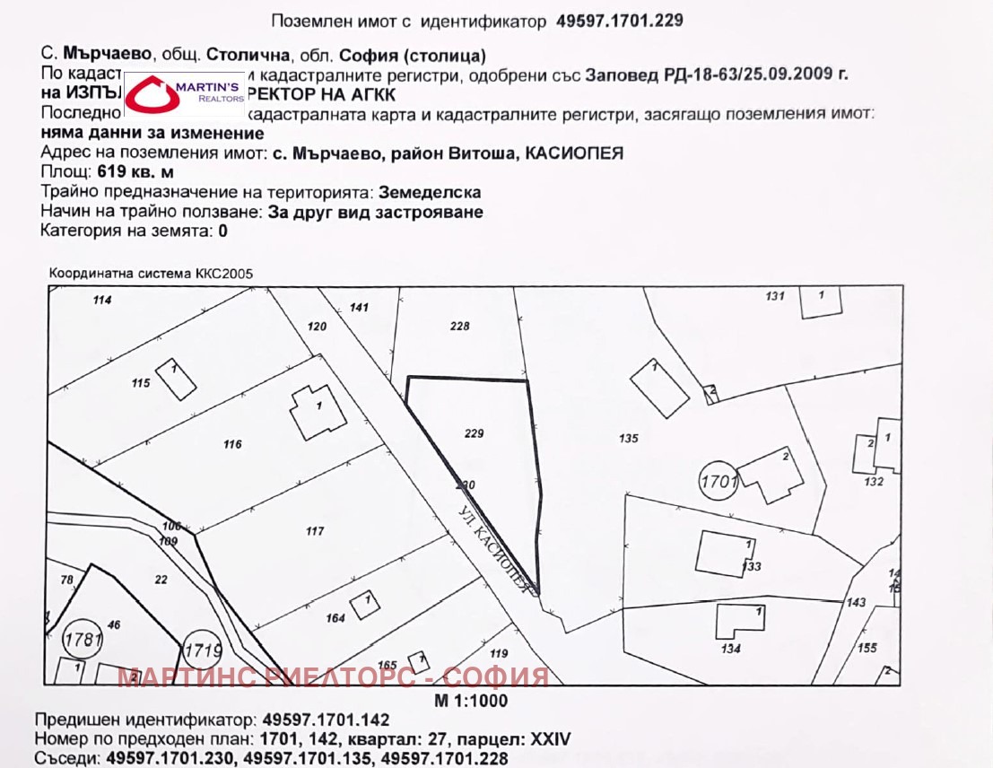 Продават се 2 съседни имота: УПИ 49597.1701.229 и УПИ 49597.1701.229, находящи се в с. Мърчаево, махала Казашка, ул. Касиопея, на около 200м от главен път Е871 (Перник-Владая-София). Двата парцела образуват общо 1538м2, от които 38м2 са отделени за тротоар и улица. Заобиколени са от постоянно населени къщи. Имотите са почистени от висока дървесна растителност